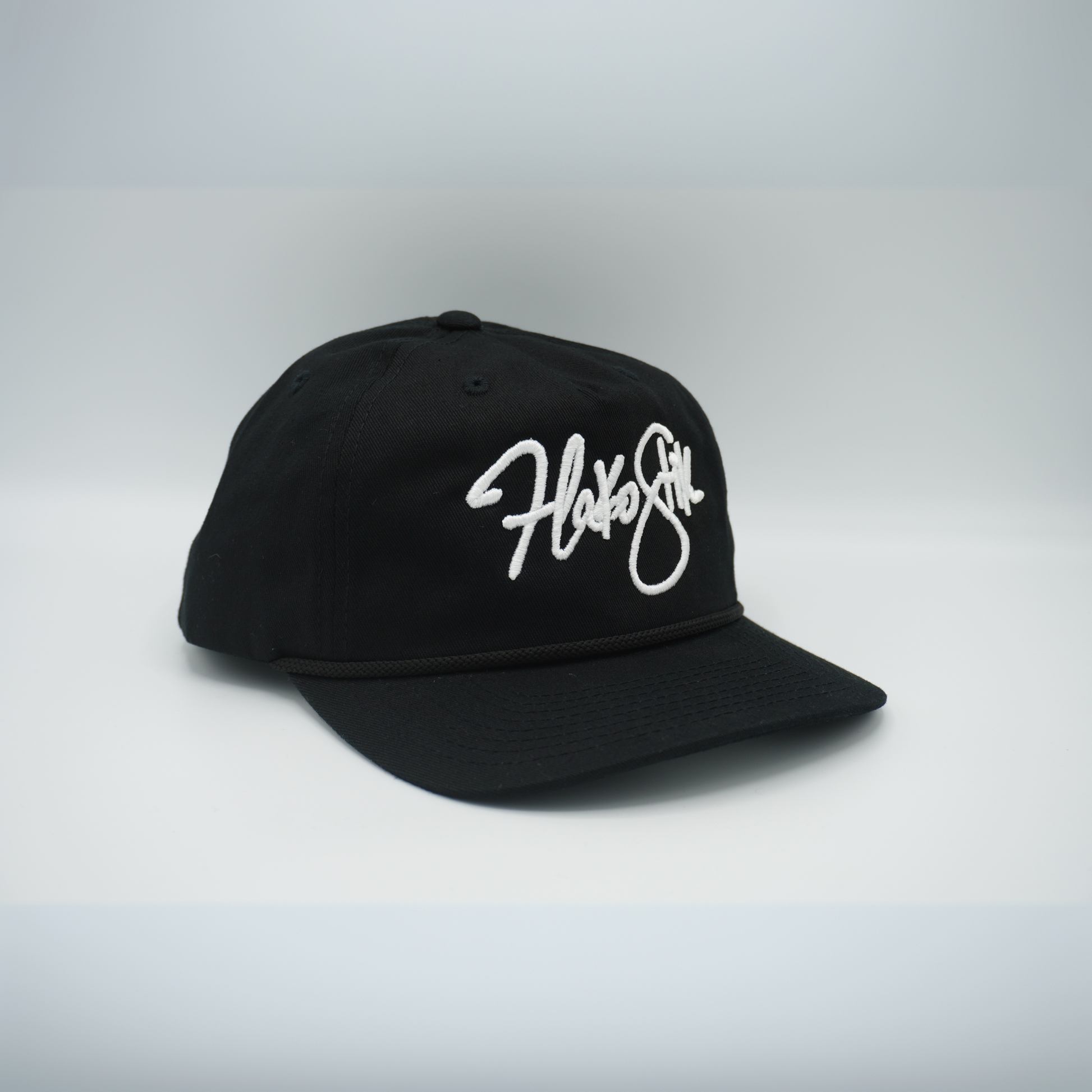 The official FLAKO STIK rope hat - a sleek, black 5-panel cap embroidered with the bold FLAKO STIK logo in white puff thread. Designed with a low-profile fit and old-school rope detail.